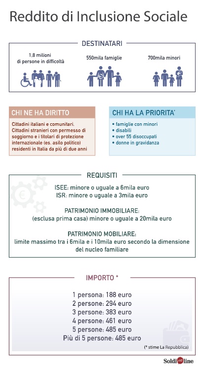 Partirà dal 1° Gennaio 2018, e sarà composto di due parti: un assegno mensile, che avrà un importo variabile secondo le dimensioni del nucleo familiare ed un progetto personalizzato di reinserimento sociale e lavorativo.
