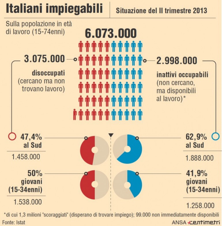 Conti alla mano un italiano su dieci allo stato attuale è fuori dal mercato del lavoro. Non ci sono soltanto i disoccupati ormai a quota 3,07 milioni, ma anche 2,99 milioni di persone che non cercano ma sono disponibili a lavorare (in pratica i «rassegnati») e quelli che cercano lavoro ma non sono subito disponibili. Totale sei milioni di persone. È l'amara fotografia scattata dall'Istat in relazione al secondo trimestre 2013.