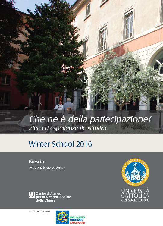 Questa seconda edizione della Winter School intende soffermarsi sul tema della partecipazione, in un tornante della vita delle nostre società in cui l’ideale di una democrazia partecipativa sembra segnare il passo, a favore di vecchie e nuove forme di dirigismo, di verticismo, di personalizzazione della dialettica sociale, politica, economica, culturale. Si diffondono “atteggiamenti che inducono il cittadino a forme partecipative insufficienti o scorrette e alla diffusa disaffezione per tutto quanto concerne la sfera della vita sociale e politica”; non di rado, inoltre, “l’elefantiasi dell’apparato burocratico nega di fatto al cittadino la possibilità di proporsi come un vero attore della vita sociale e politica” (Compendio della Dottrina sociale della Chiesa, 191). Tuttavia, in taluni spazi del vivere comune, si manifestano i segnali di un’inversione di tendenza, di un riemergere della volontà di vivere la propria appartenenza alla polis da protagonisti, e non da semplici spettatori, sperimentando forme inedite di creatività personale e di costruttività sociale.