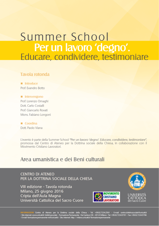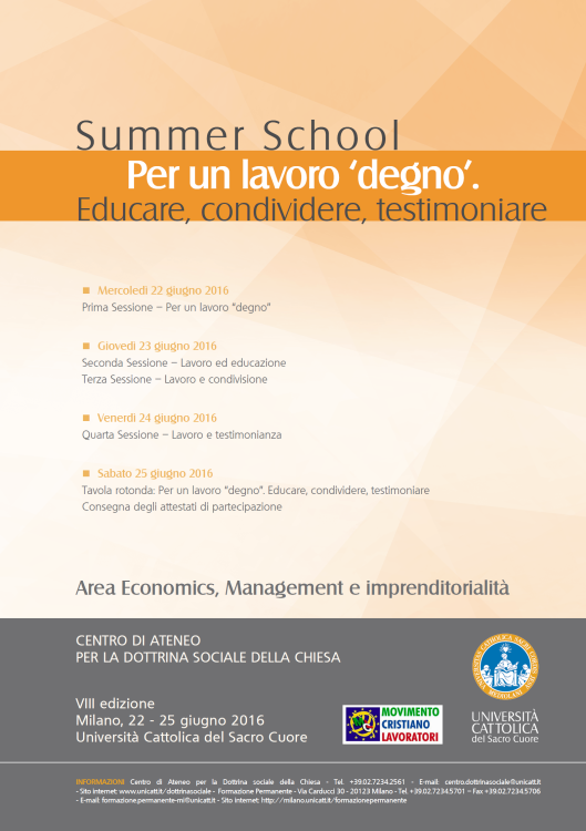 Questa ottava edizione della Summer School si propone dunque di recuperare e di rifondare i lineamenti di un lavoro ‘degno’, nella persuasione che “nel lavoro libero, creativo, partecipativo e solidale l’essere umano esprime e accresce la dignità della propria vita” (Francesco, Evangelii Gaudium, 192). Riflettendo su aspetti e momenti cruciali del magistero sociale della Chiesa ed avvalendosi degli esiti più avanzati della ricerca scientifica e del contributo di esperienza di attori significativi del mondo delle professioni, della formazione al lavoro e dell’auto-imprenditoria giovanile, ci si soffermerà in particolare sulle “tre parole” – educazione, condivisione, testimonianza – che di recente Papa Francesco ha suggerito di approfondire, perché si possa dar vita a “un nuovo umanesimo del lavoro, dove l’uomo, e non il profitto, sia il centro; dove l’economia serva l’uomo e non si serva dell’uomo” (Discorso al Movimento Cristiano Lavoratori, 16 gennaio 2016).