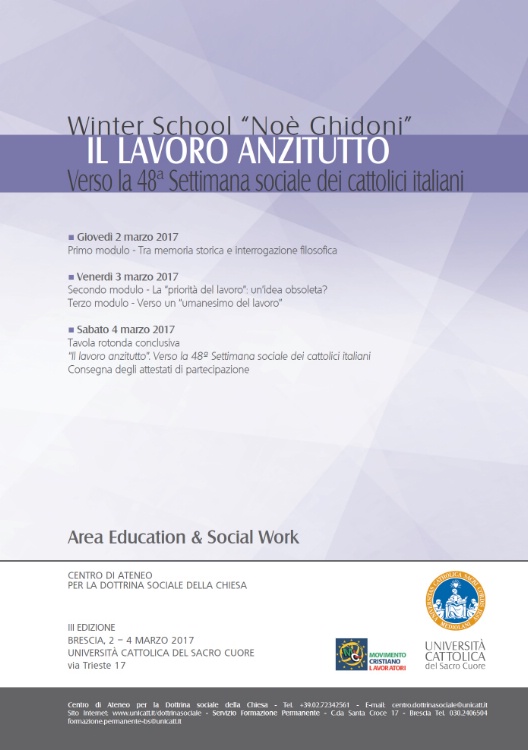 La difficile situazione del lavoro – nel nostro Paese e non solo – richiede un rinnovato sforzo di analisi, di valutazione e di proposta, che non si limiti a evidenziare ciò che drammaticamente manca, ma ne esplori le cause profonde e i possibili rimedi. Occorre anche saper riconoscere – come ha detto lo stesso Presidente Mattarella – che “moltissimi nostri concittadini hanno operato con impegno e con senso di responsabilità, in settori diversi e con compiti differenti” e “hanno contribuito in questo modo, malgrado la crisi, a tenere in piedi l’economia italiana”. È secondo queste prospettive che si guarderà al tema del lavoro in questa terza edizione della Winter School, promossa dal Centro di Ateneo per la Dottrina sociale della Chiesa in collaborazione con il Movimento Cristiano Lavoratori. Competenze disciplinari ed esperienze professionali diverse confluiranno in una comune ricerca, volta a verificare se e come sia possibile oggi, in un tempo in cui il lavoro si presenta come un “bene scarso”, invertire la rotta e dar vita a quel “nuovo umanesimo del lavoro”, di cui parla Papa Francesco.